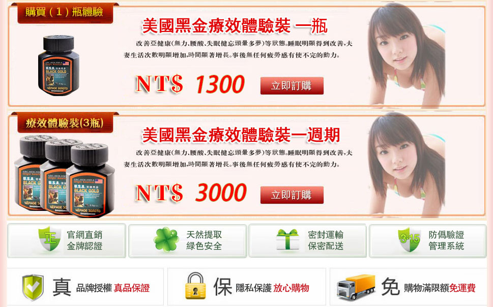 • 美國黑金可以在服用半小時內讓你快速勃起,不在是一個軟男子!長期服用更有保養作用: