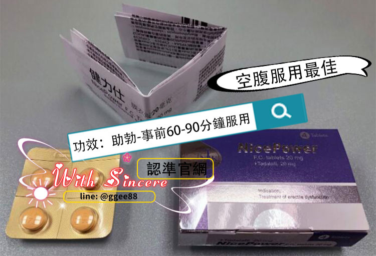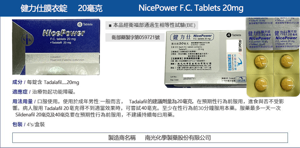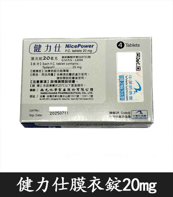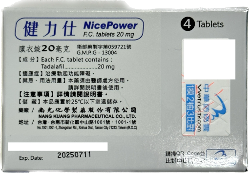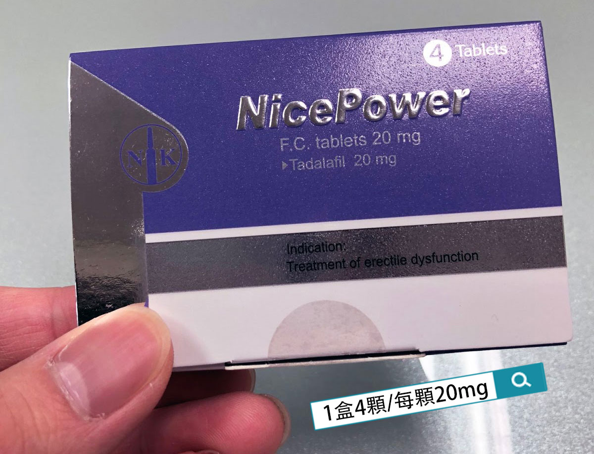 • 每盒含 4 錠 健力仕膜衣錠 NicePower 20mg,每錠含 20mg Tadalafil(犀利士成分)