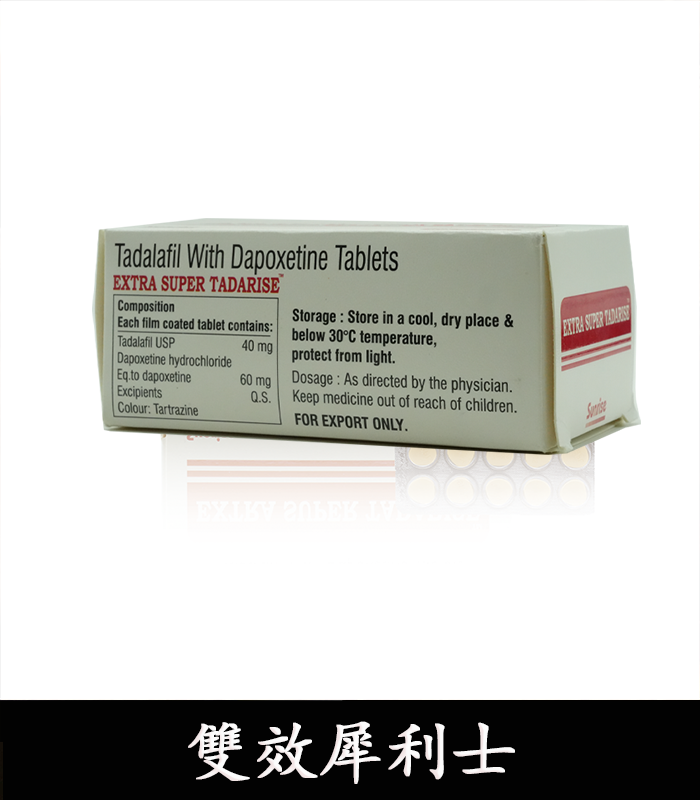 Super Tadarise印度雙效犀利士是一種強大的藥物,逐漸成為台灣眾多男士的認可和青睞,它的效果非常顯著,可以幫助男性治療陽痿和早洩。 印度Super Tadarise雙效犀利士成份為他達拉非與達泊西汀。每1粒SUPER TADARISE超級雙效犀利士包含他達拉非40mg(1粒犀利士)+ 達泊西汀60mg,具有助勃與延時雙重功效。因其效果非常猛,建議房事提前1-3小時服用,並且配一大杯溫開水。